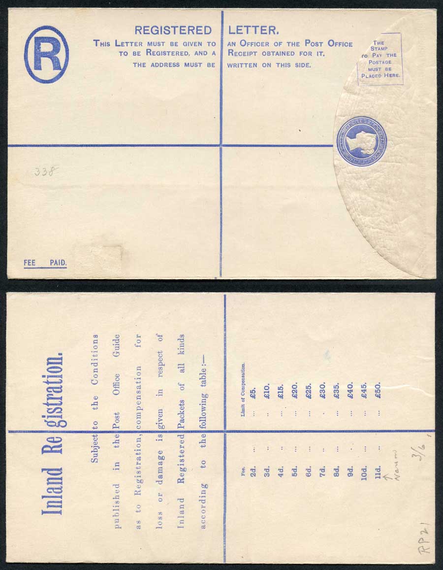 RP23 QV 2d Blue Registered Envelope Size H MINT