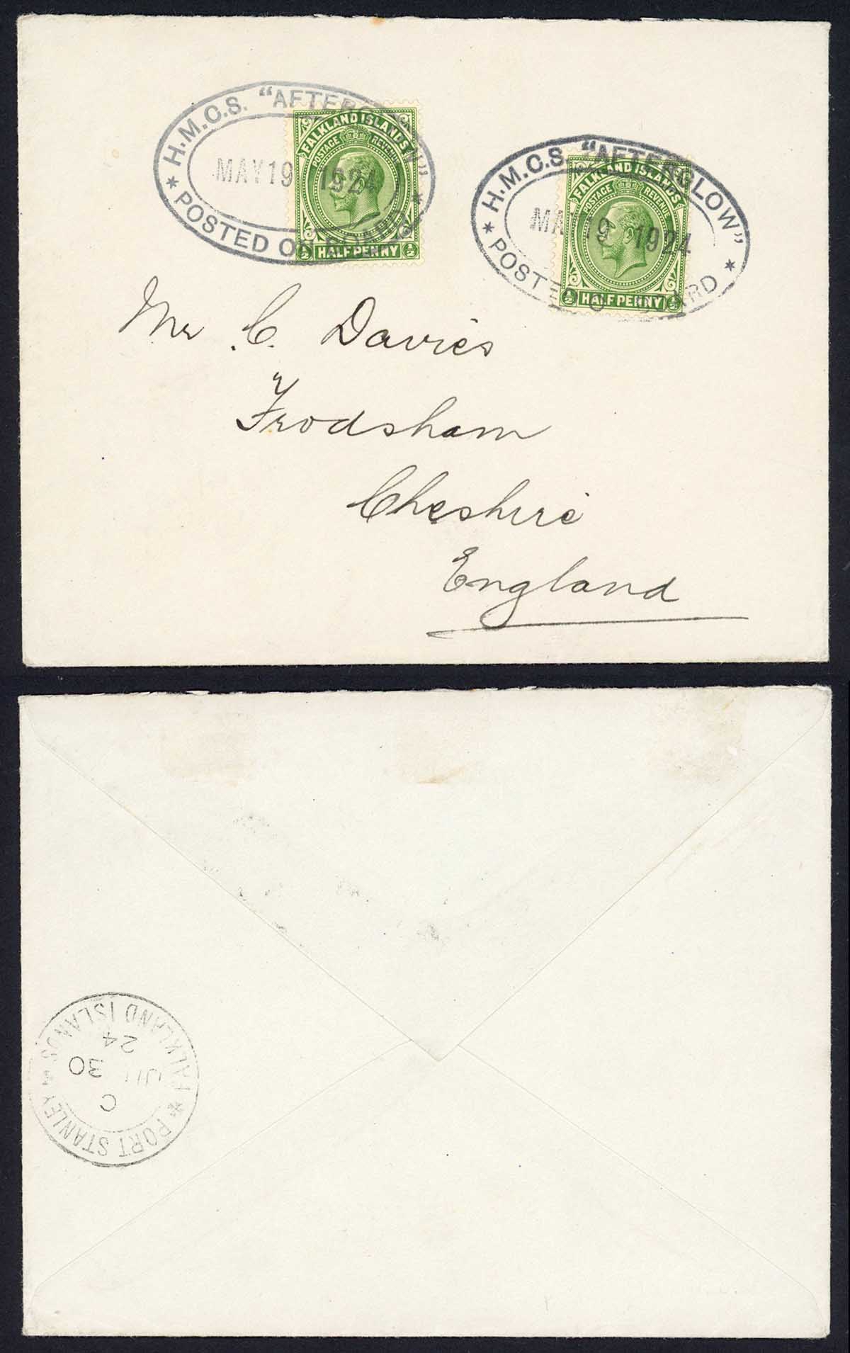 1924 Davies envelope bearing two 1/2ds cancelled by individual very fine strikes of the oval H.M.C.S. AFTERGLOW handstamp in black very neat. Heijtz SC 5