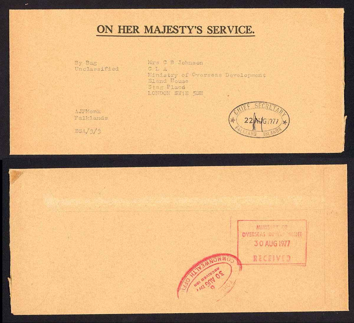 You're viewing: Falkland Is 1977 OHMS with Chief Secretary Handstamp sent via unclassified Bag£12.00Original price was: £12.00.£11.04Current price is: £11.04.