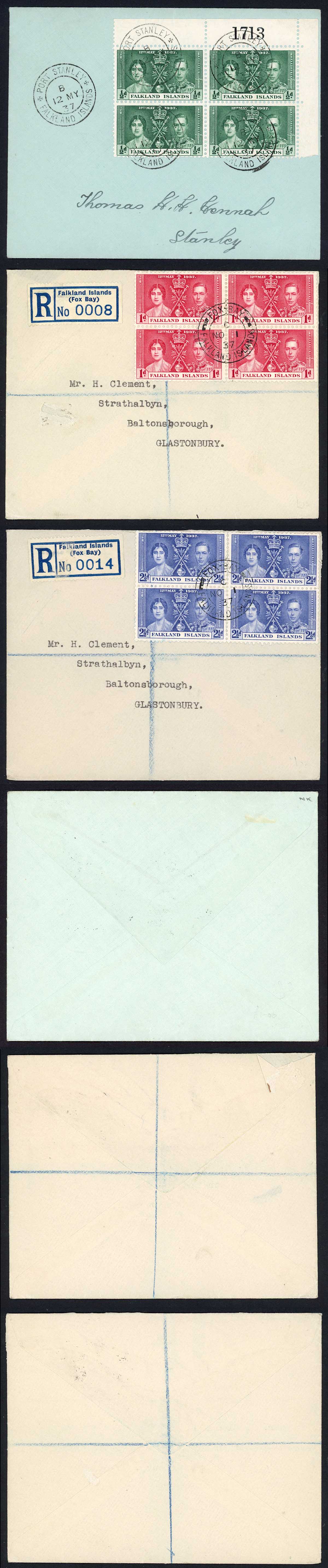 Falkland Is SG143/5 1937 Coronation set in Blocks on Cover (different Pmks)
