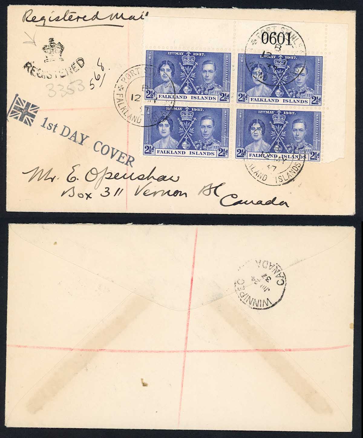Falkland Is SG145 1937 Coronation 2 1/2d on Registered Printed FDC