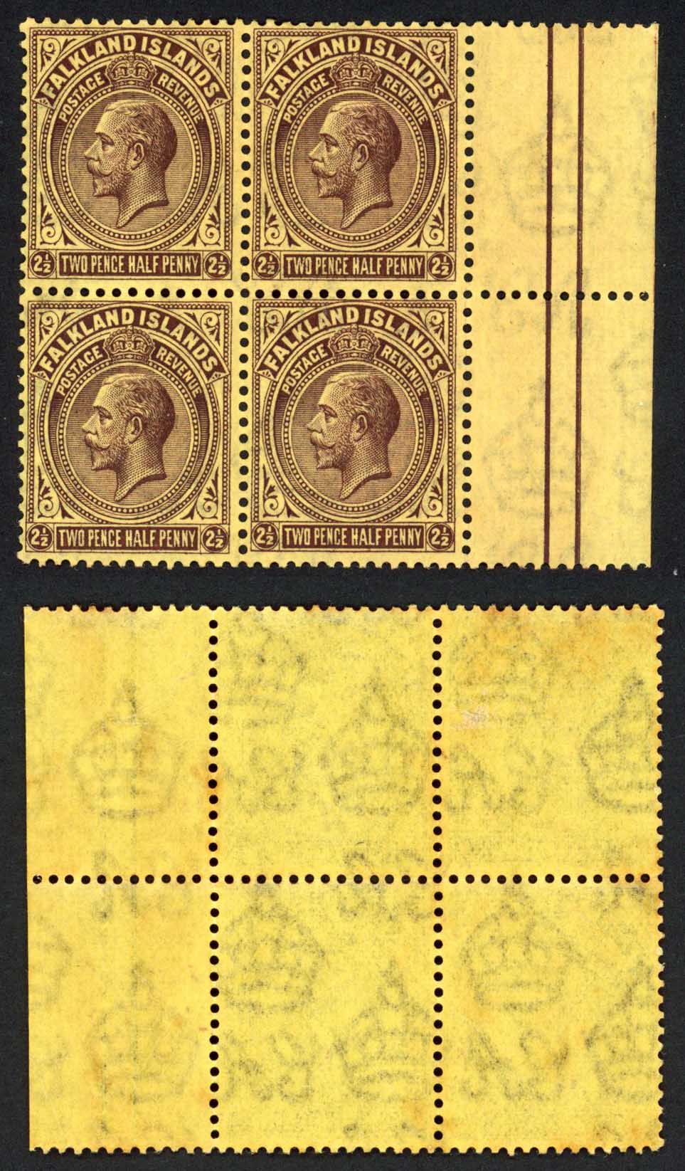 Falkland Is SG77 2 1/2d Deep purple/pale yellow Wmk Script M/M Cat 22++ pounds