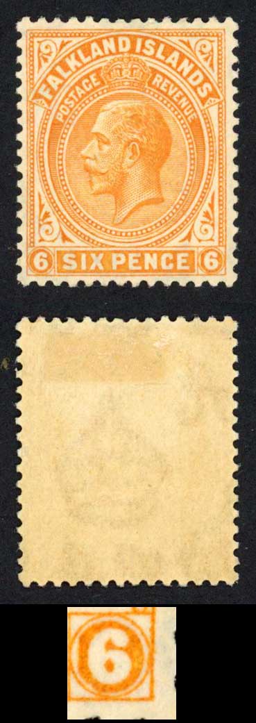 Falkland Is SG78 6d yellow-orange DAMAGED VALUE TABLET Wmk Script M/M