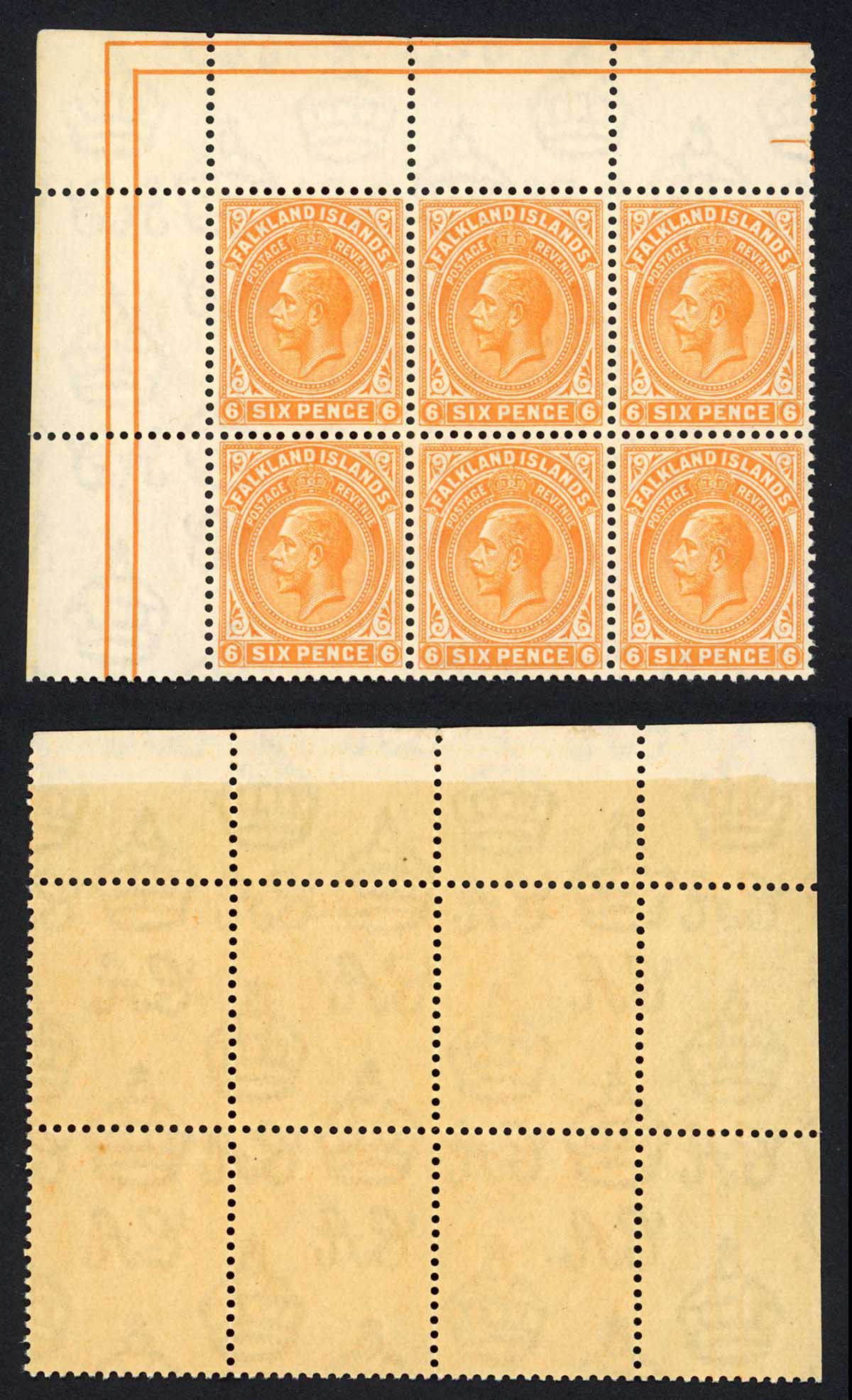 Falkland Is SG78 6d yellow-orange Wmk Script U/M Corner Block Cat 66++ pounds