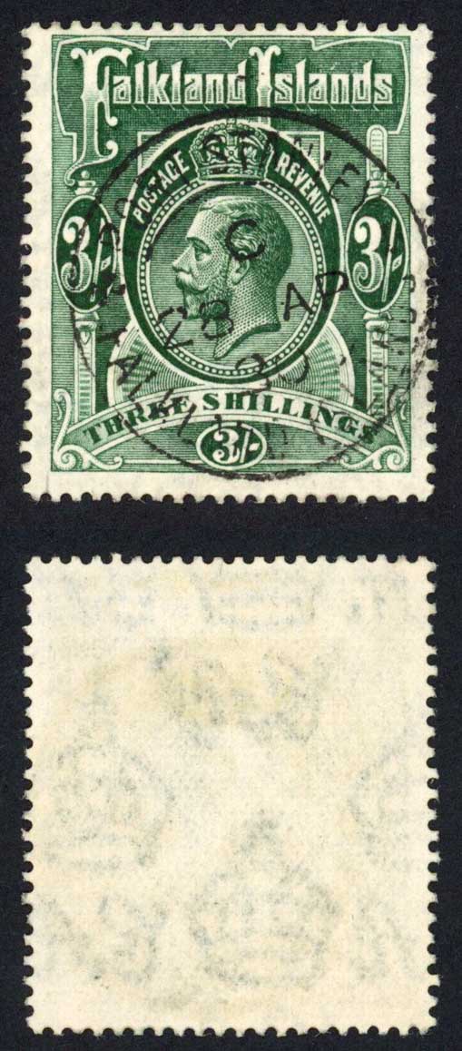 Falkland Is SG80 3/- Slate-green Wmk Script 1930 CDS Cat 170 pounds