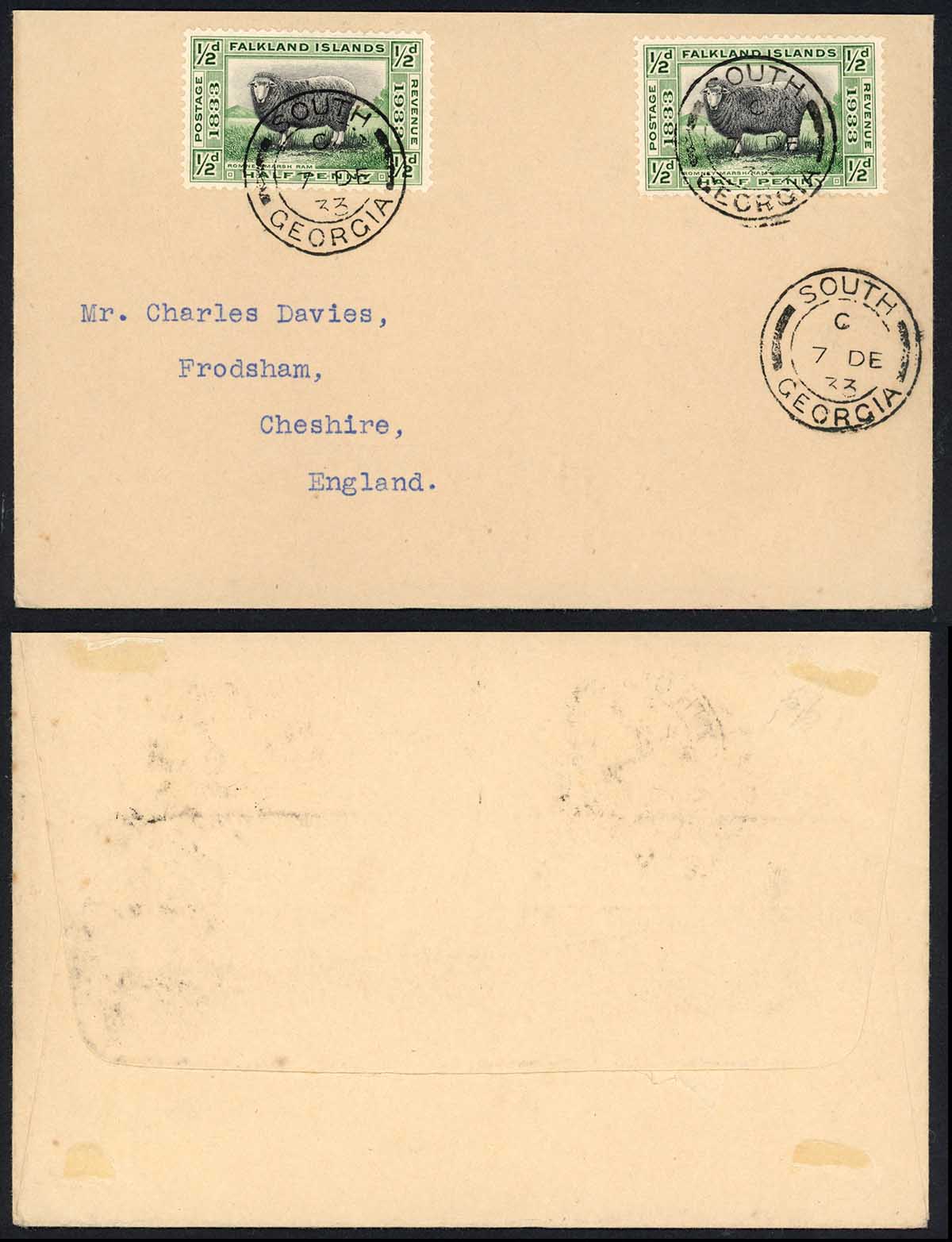 Falkland Is South Georgia 1/2d x 2 Centenary on cover to England