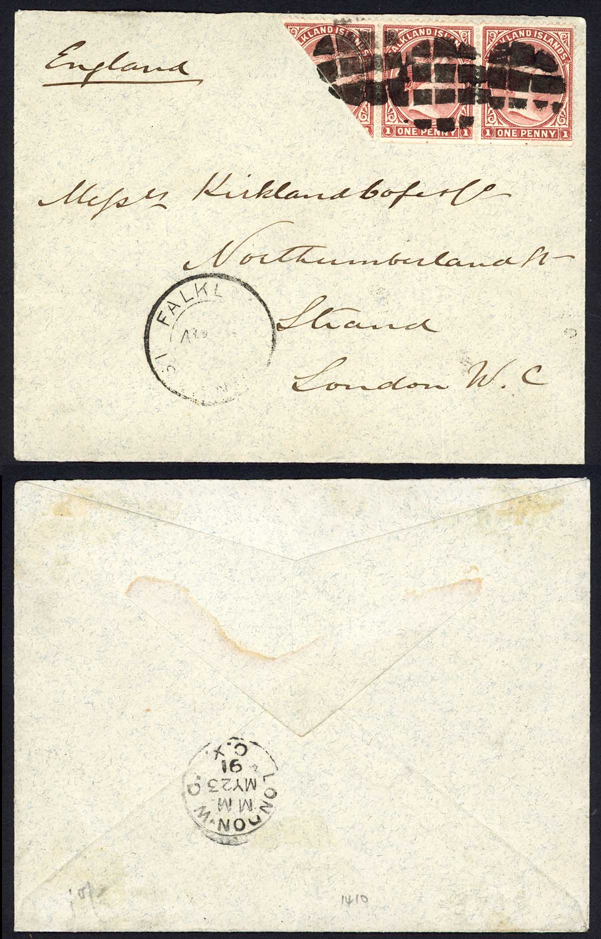 1891 envelope to London bearing horizontal strip of three 1d brownish claret from the foot of the sheet the left stamp bisected diagonally and tied by bold strikes of cork cancel. Part despatch strike on front London arrival (MY 23) on reverse. Backflap missing but clean and attractive item F7 in the Barton listing.