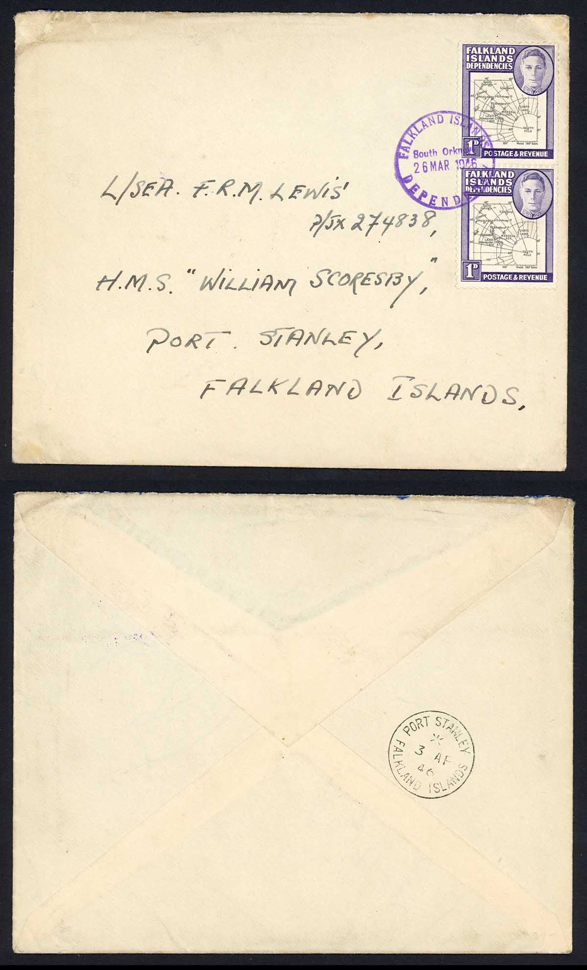 26th March 1946 cover from South Orkneys to a Sailor on HMS William Scoresby (Decommissioned in September 1946) at Port Stanley franked by 1946 1d Black and Violet Thick Map vertical pair tied by a very fine strike of the type C2 CDs in Violet. Arrival backstamp of 3 AP 46. A Scarce Commercial Early Usage