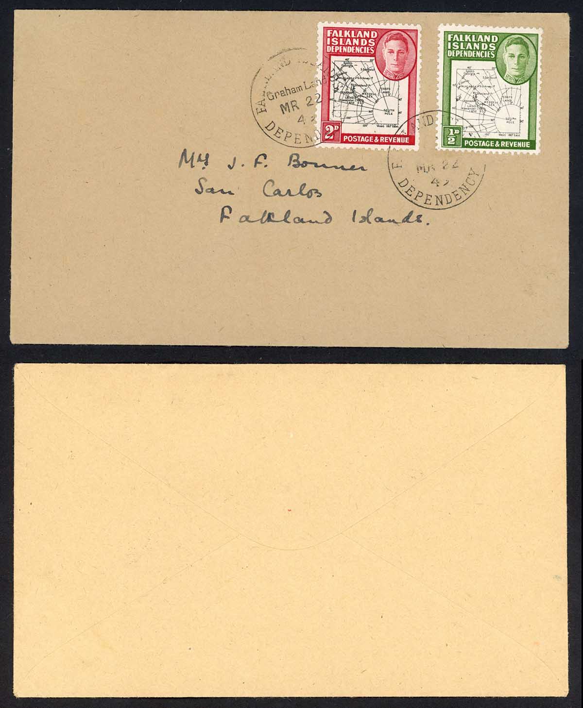 22 March 1949 Philatelic cover from Port Lockroy to San Carlos Franked by 1946 Thick Map 2d and a 1948 Thin Map 2 1/2d (showing variety dot on T of South) tied be two strikes of type A Graham Land CDS. The basic 12d variety off cover is cat 60 pounds