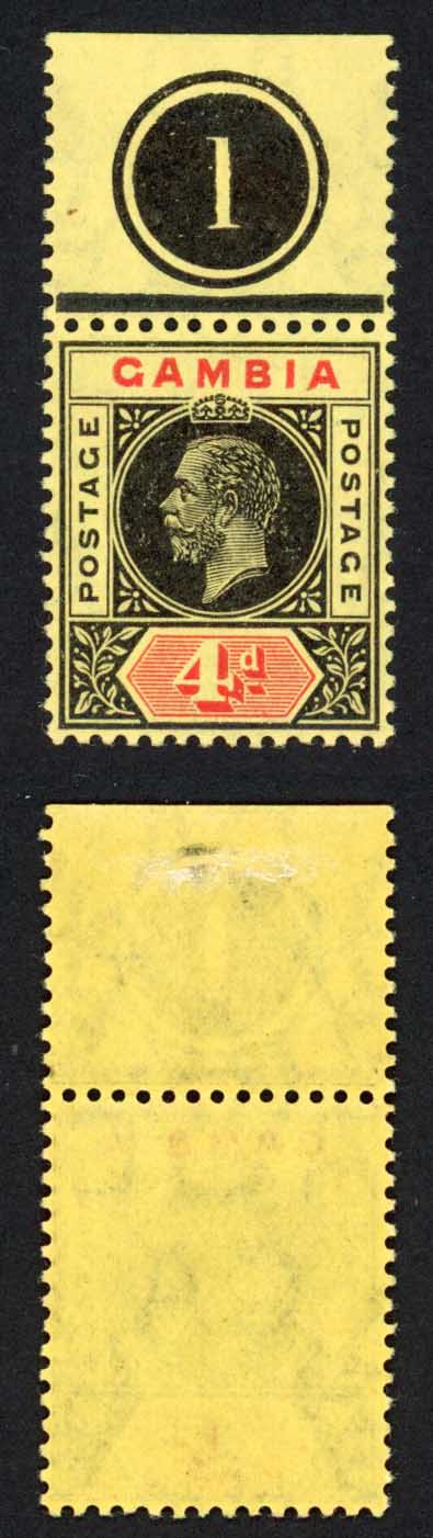 Gambia SG92 4d Black and red/yellow Wmk Mult CA Plate Number Example U/M