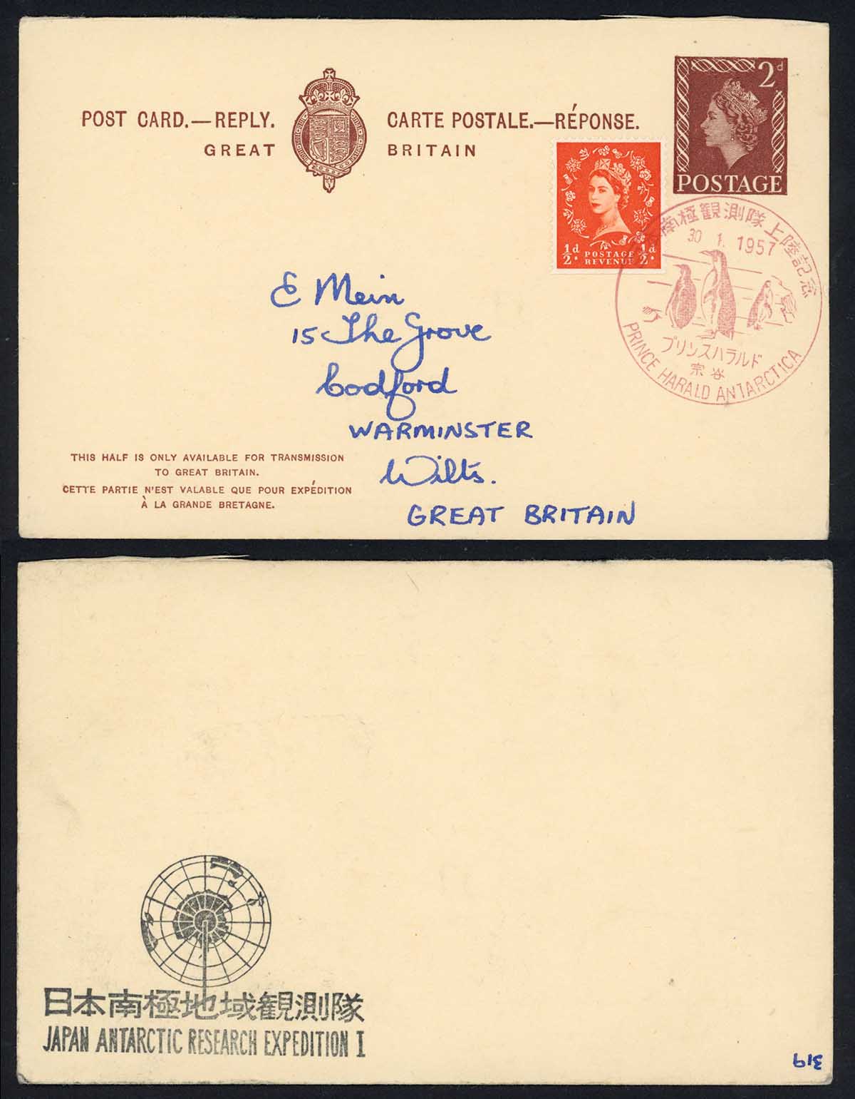 GB reply card used 1957 Prince Harald Antarctica H/Stamp