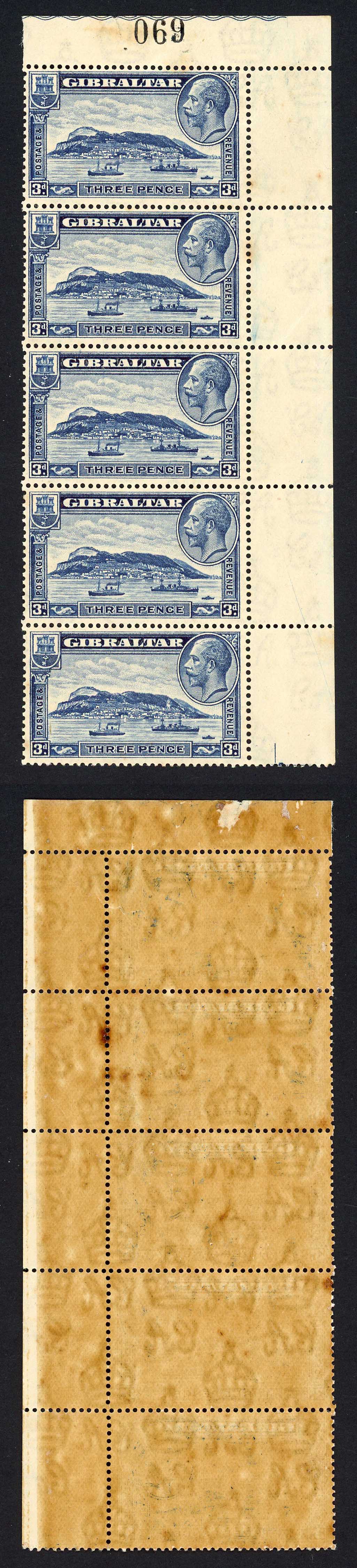 Gibraltar SG113 3d Blue Perf 14 Strip of 5 U/M (Brown Gum) Cat 55 pounds