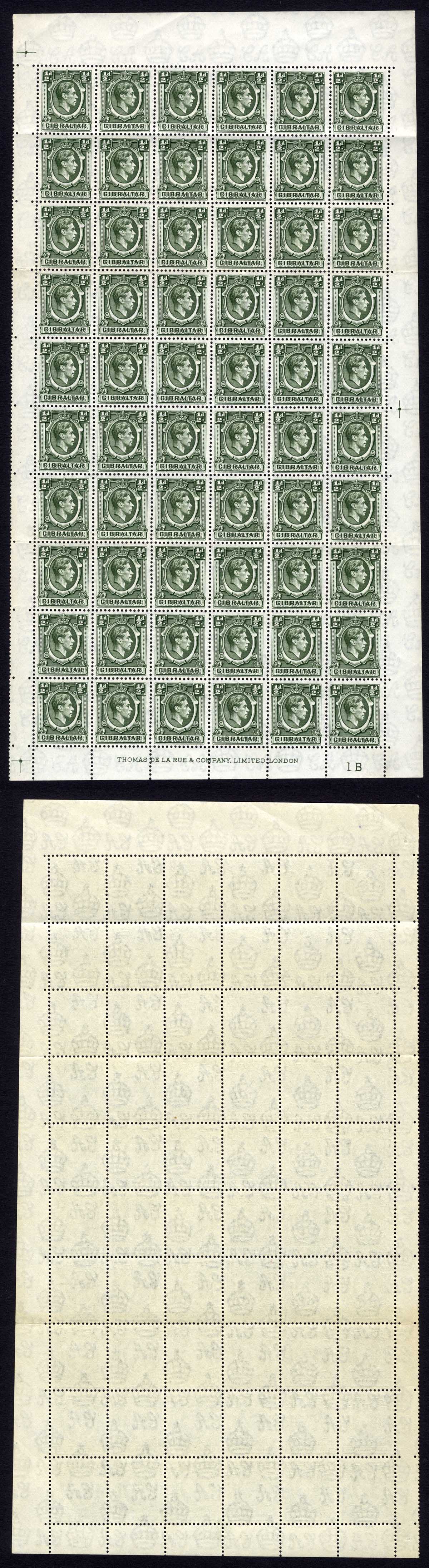 Gibraltar SG121 1/2d Deep Green Pane of 60 U/M