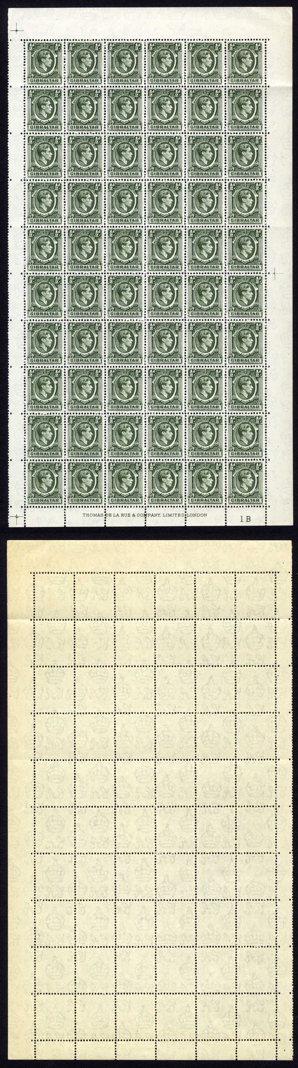 Gibraltar SG121 1/2d Deep Green Pane of 60 U/M