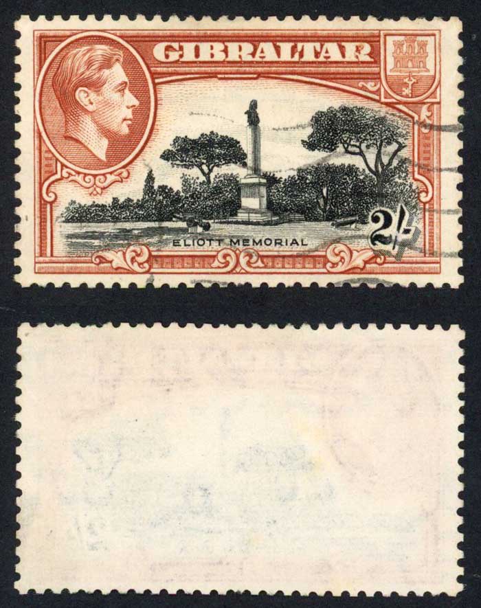 Gibraltar SG128ba 1938-51 2/- Black and brown Broken R Fine used Cat 1900 pounds