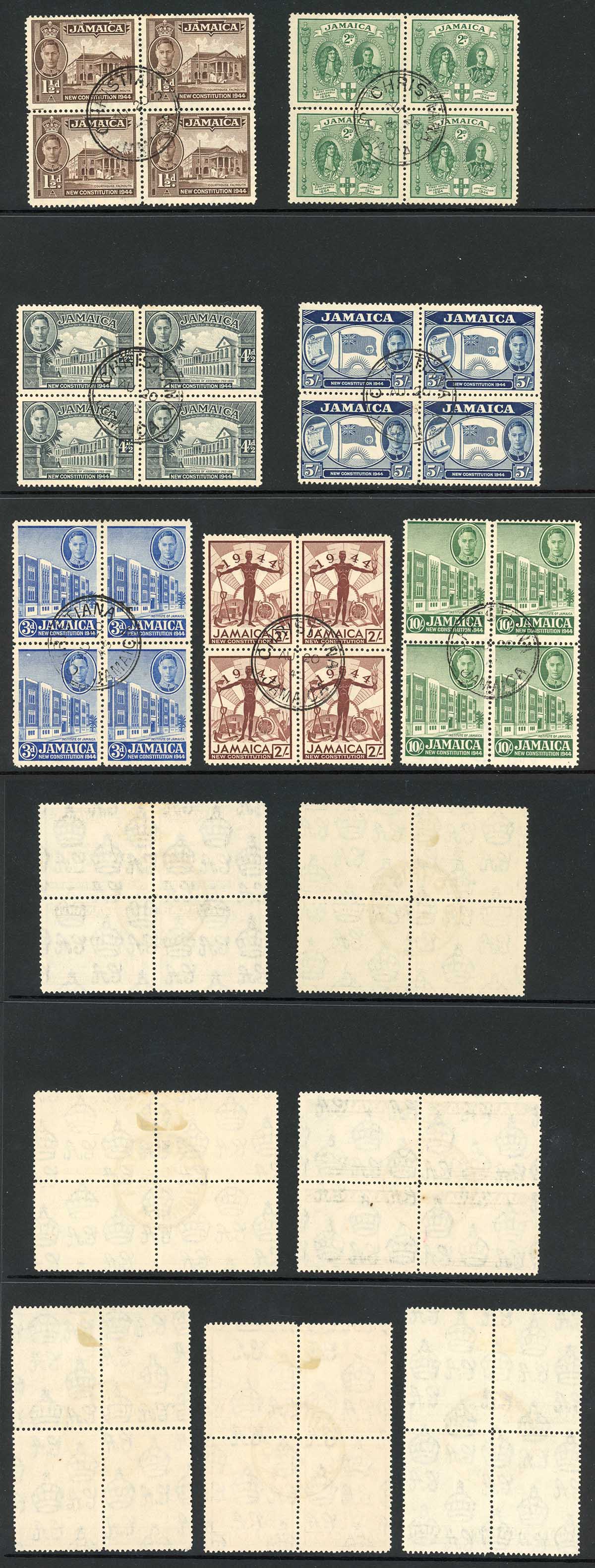 Jamaica SG134/40 1945 Set of 7 used in Blocks Cat 24 pounds
