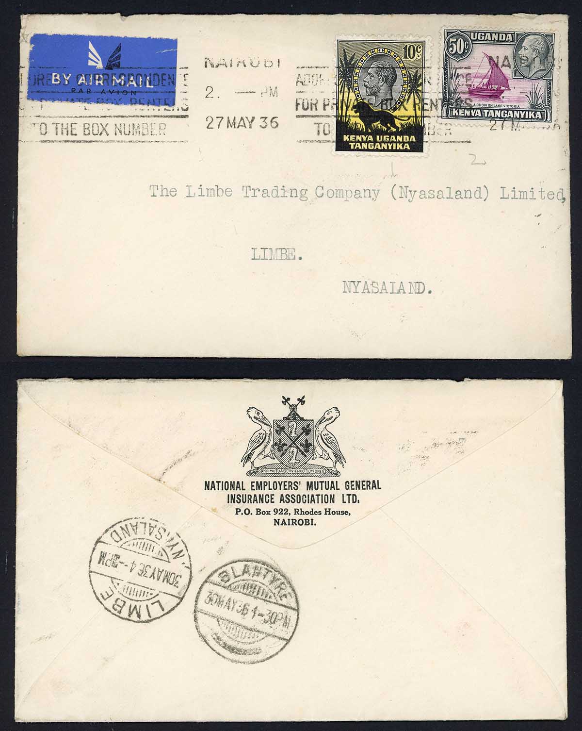 KUT KGV 50c and 10c on Airmail cover to Nyasaland