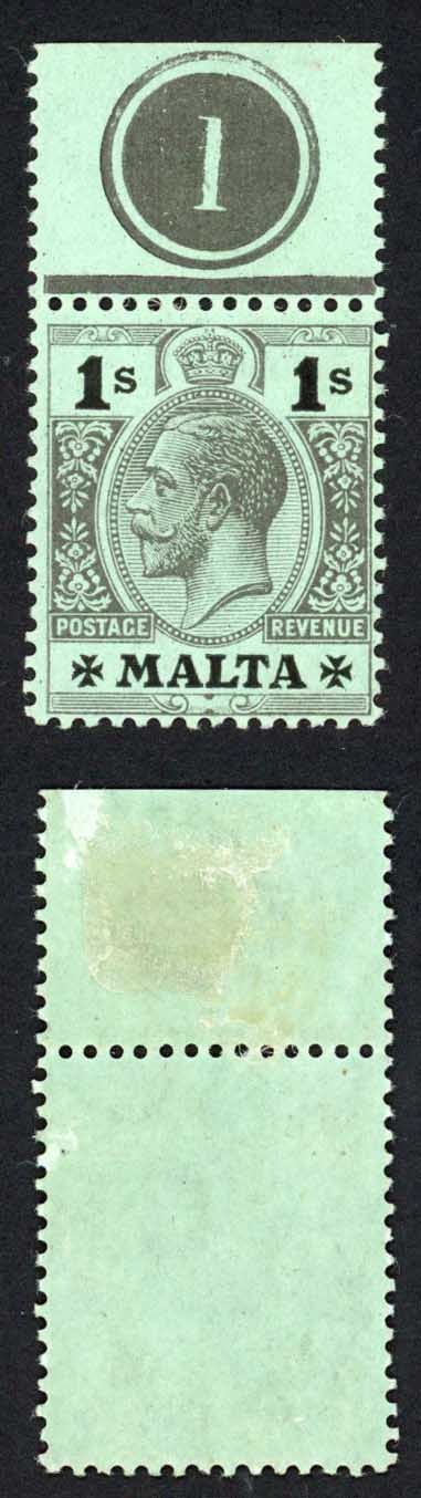 Malta SG81 1/- Black/blue-green green back Plate example M/M