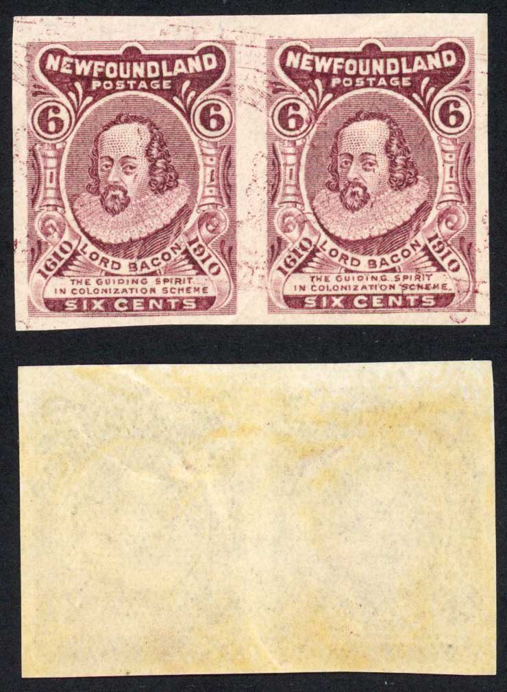 Newfoundland SG111 6c Claret Imperf Pair (wrinkle) M/M Cat 250 pounds