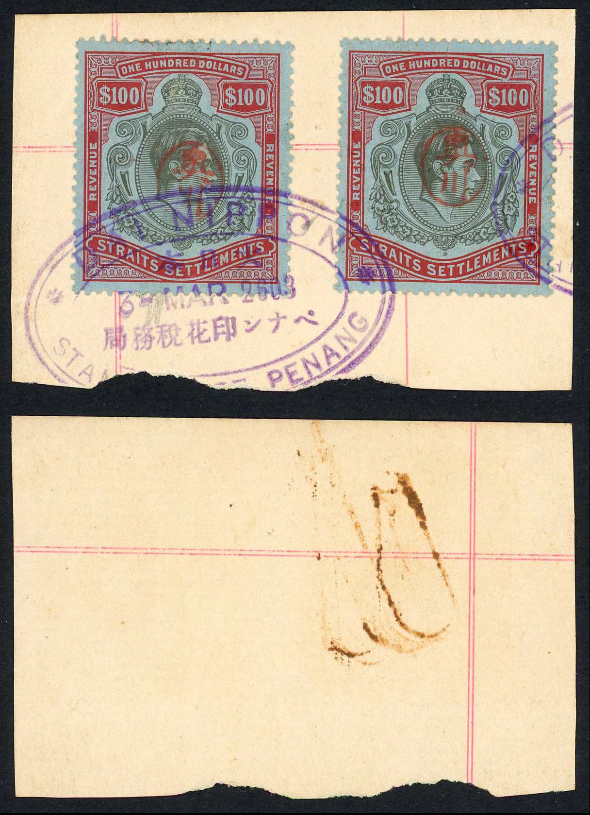 Penang Japanese Occupation 100 Dollar Revenue x 2 BF122 on Piece RARE