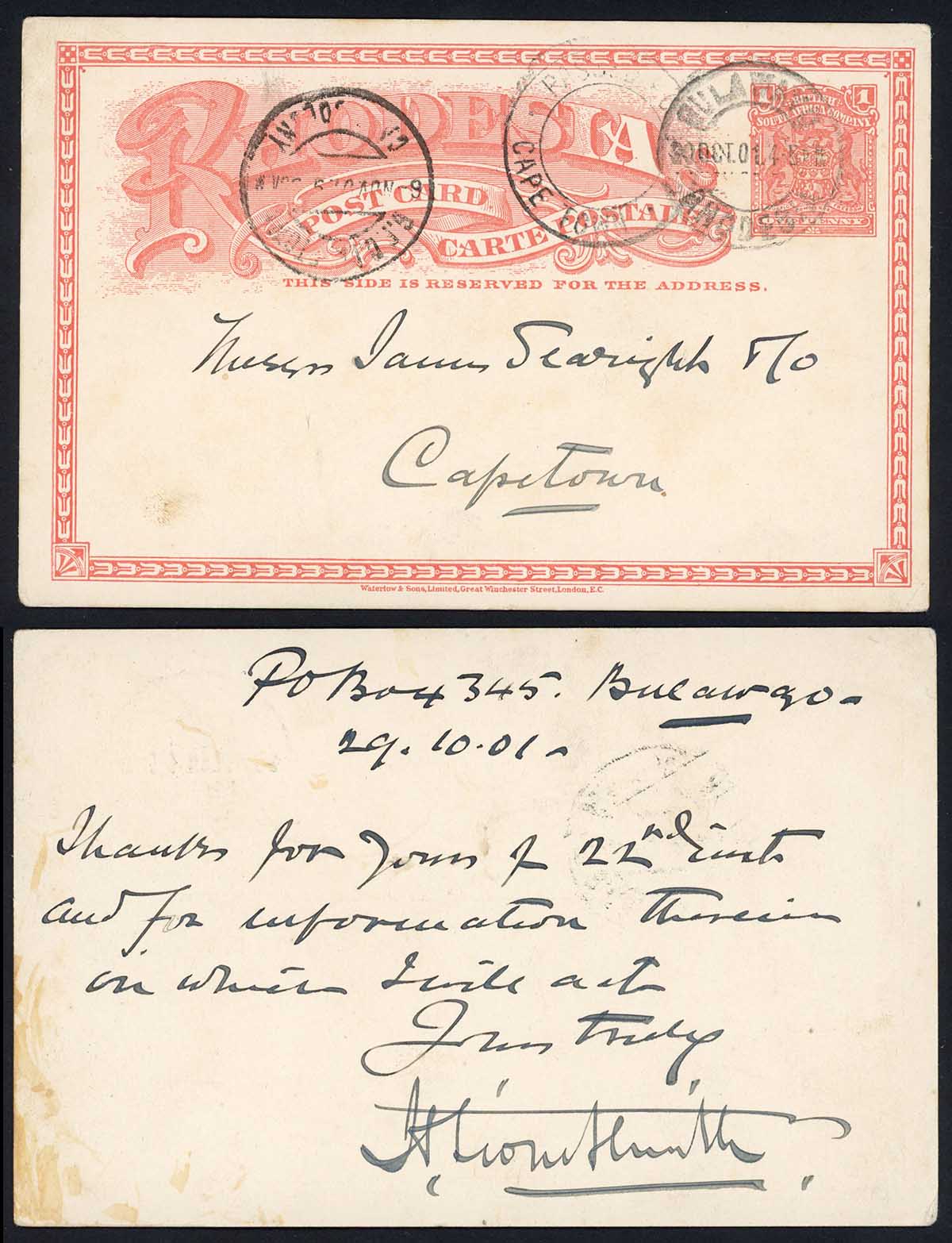 Rhodesia 1901 1d Stationery Card to Cape Town