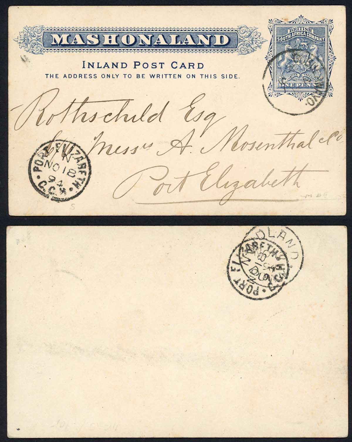 Rhodesia DG5 1d Mashonaland Postcard to Port Elizabeth
