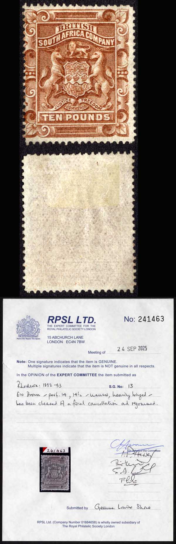 Rhodesia SG13 Ten Pounds Brown Cleaned fresh colour