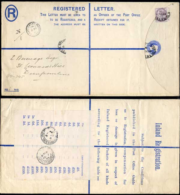 RP20 QV 2d Blue Registered Envelope size K Uprated Label On back