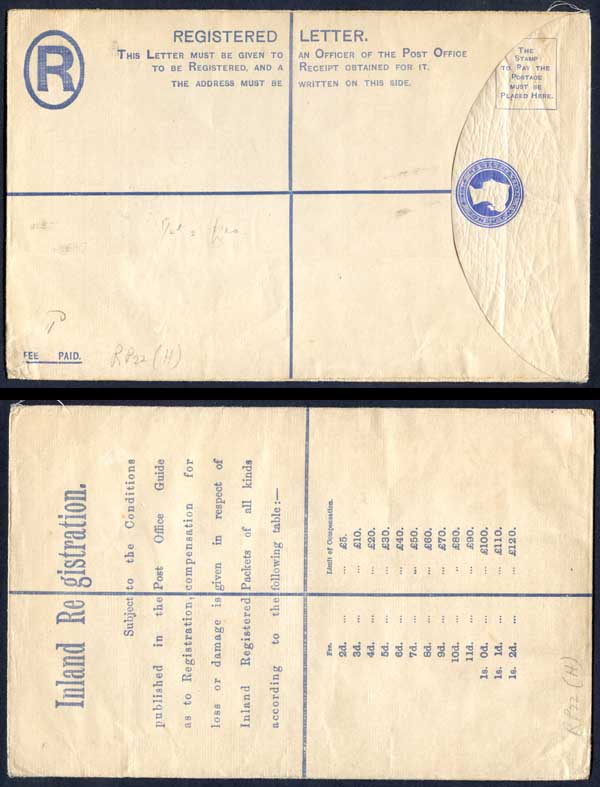 RP22 QV 2d Blue Registered Envelope Size H 50-120 on Back Mint