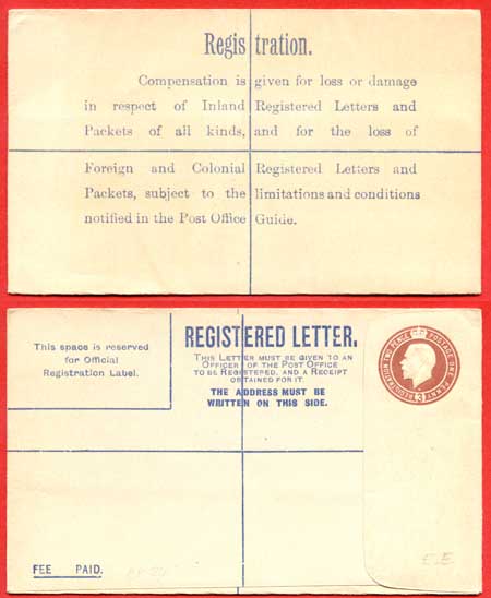 RP27b KGV 3d Registered Envelope W Below Neck Size F Imprint EE under Flap
