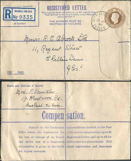 RP52 KGVI 5 1/2d Brown Registered Envelope No Selling Price on Front Size G Used