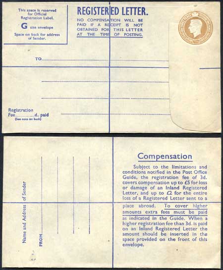 RP64 KGVI 5 1/2d Brown Registered Envelope PA and Co Imprint Blue Lining Size G