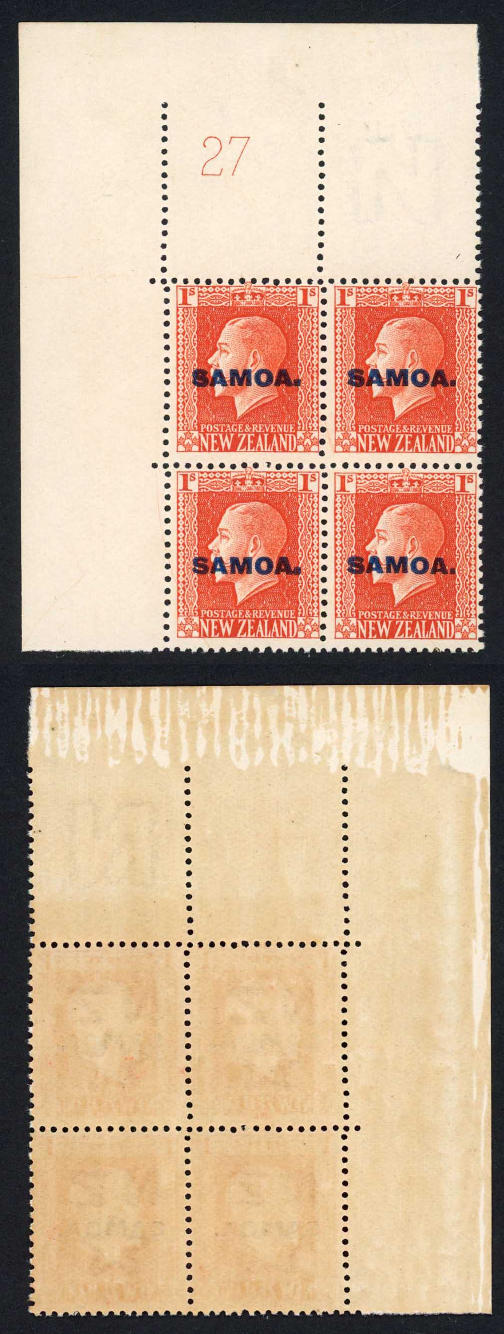 Samoa SG121 1914-15 1/- vermilion plate block U/M Scarce