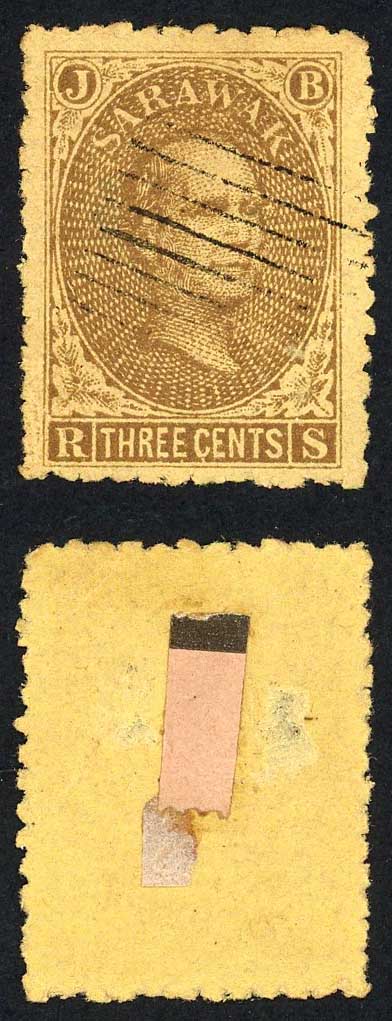 Sarawak SG1 3c Brown/yellow used with 9 Bar pmk Very Scarce Cat 250 pounds