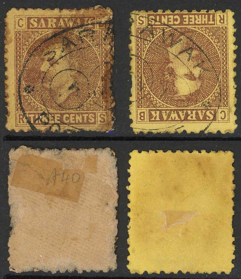 Sarawak SG2 3c Brown/yellow Sarawak Large Double Oval pmk over 2 stamps