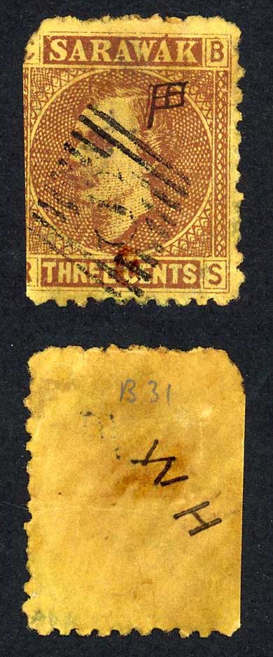 Sarawak SG2 3c Brown/yellow with a company chop Very Rare