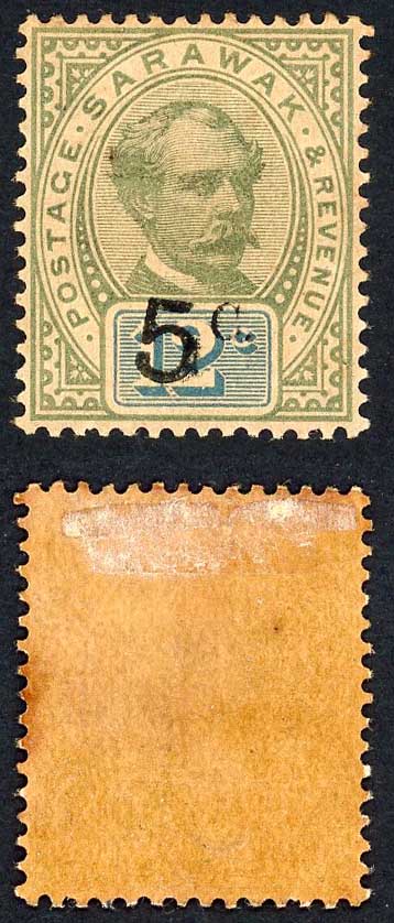 Sarawak SG25 5c on 12c Green and Blue (stop after c) M/M (toned) Cat 45 pounds
