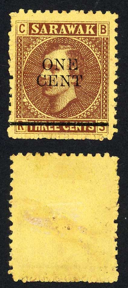 Sarawak SG27 1c on 3c Brown/yellow Blind Perfs Mint (no gum as normal)