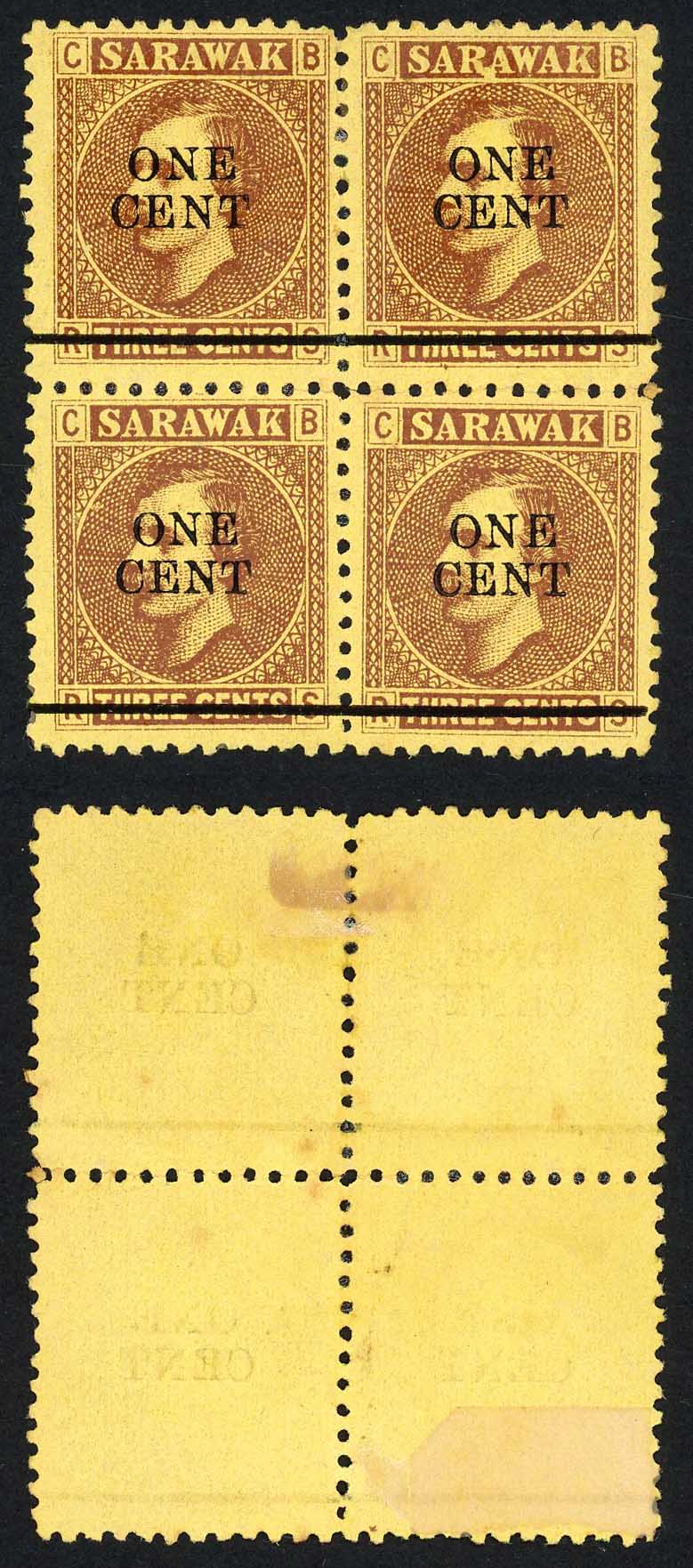 Sarawak SG27 1c on 3c Brown/yellow Block (no gum as normal) Cat 40++pounds