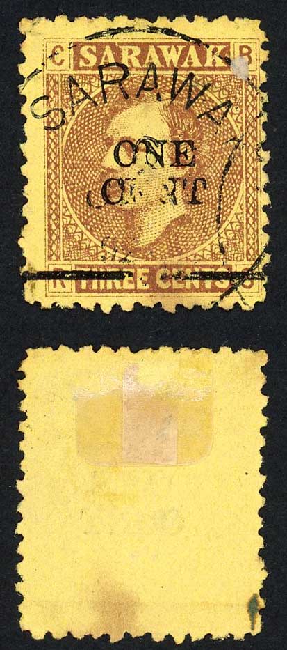 Sarawak SG27 1c on 3c Brown/yellow Overprint partially omitted