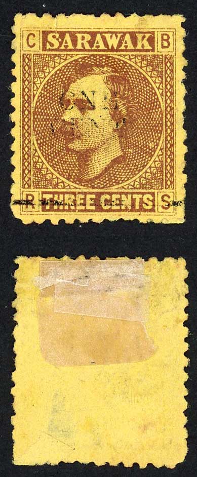 Sarawak SG27 1c on 3c Brown/yellow Overprint partially omitted
