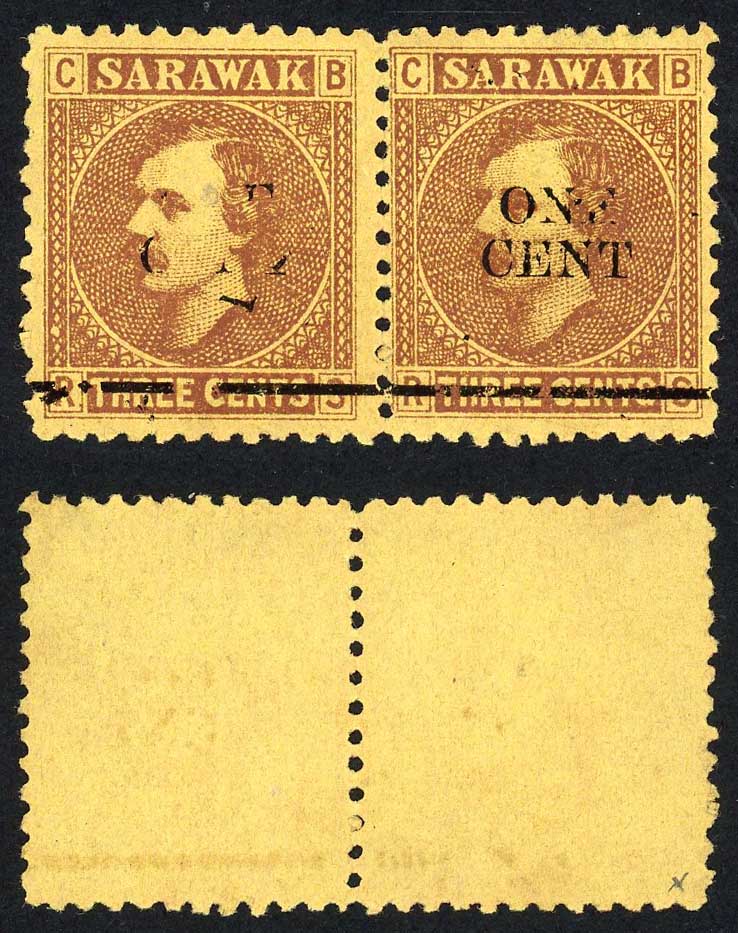Sarawak SG27 1c on 3c Brown/yellow part of left hand overprint missing