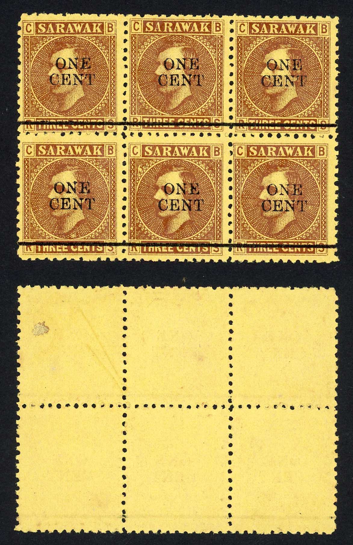 Sarawak SG27 1c on 3c Brown/yellow Top Middle Stamp Narrow A Cat 60++ pounds