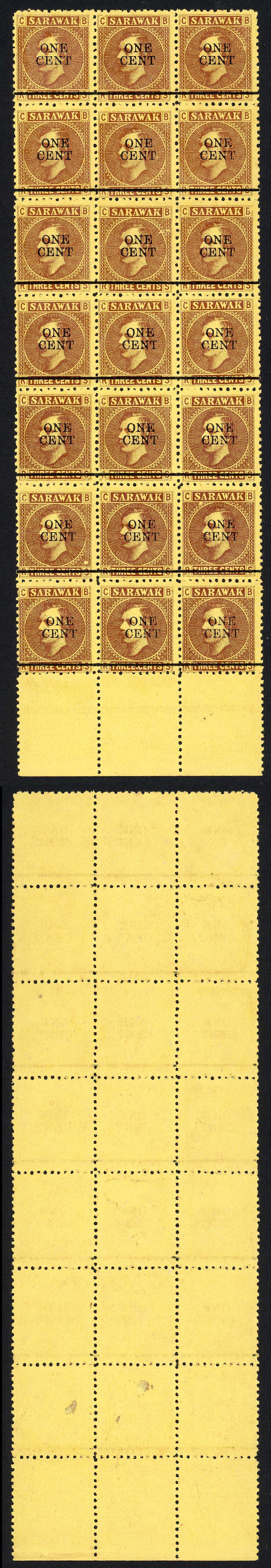 Sarawak SG27a 1c on 3c Bottom middle stamp Spot after Three Cat 275+ pounds