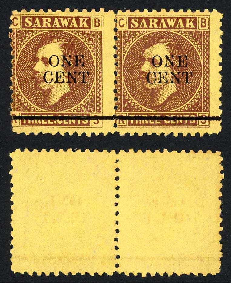 Sarawak SG27a 1c on 3c Brown/yellow Stop after Three Mint Cat 85 pounds in a Pair