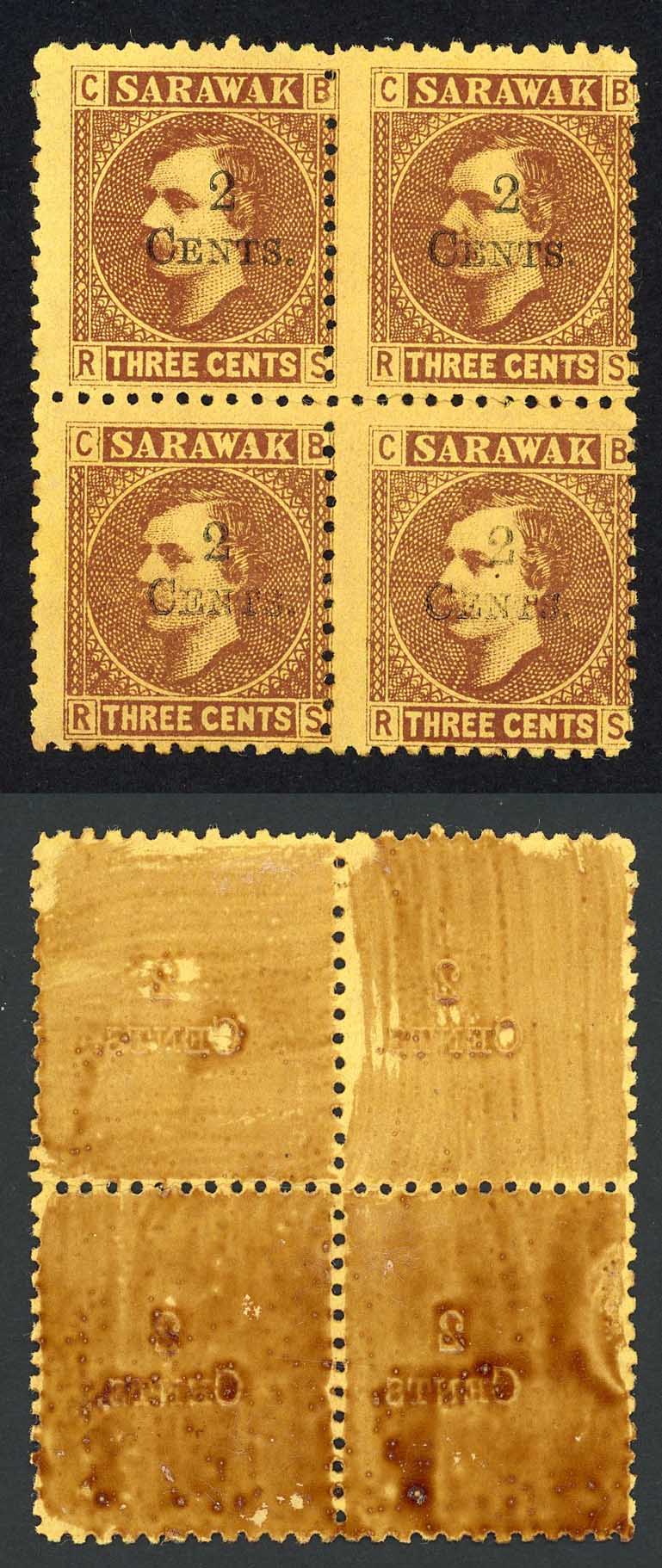 Sarawak SG32 2c on 3c Mint Block Cat 20+++ pounds