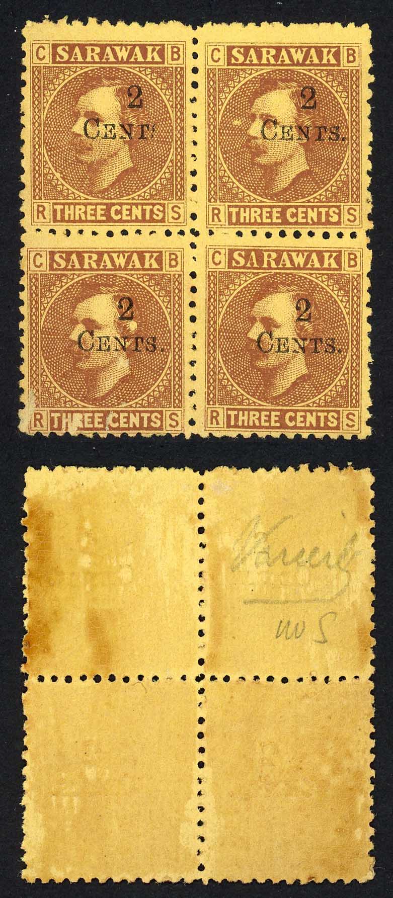 Sarawak SG32 2c on 3c Mint Block Cat 20+++ pounds