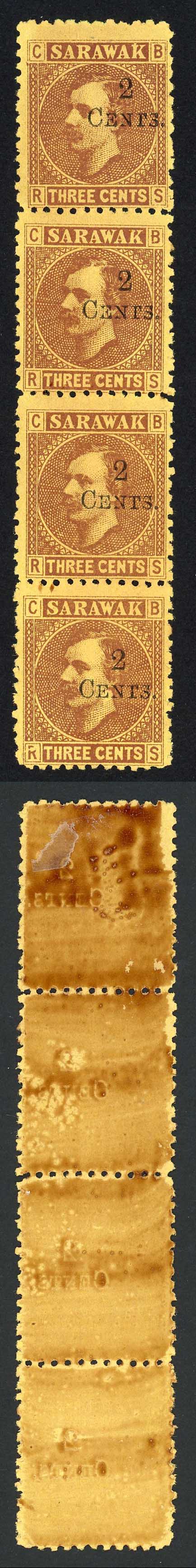 Sarawak SG32 2c on 3c Mint Strip Cat 20+++ pounds