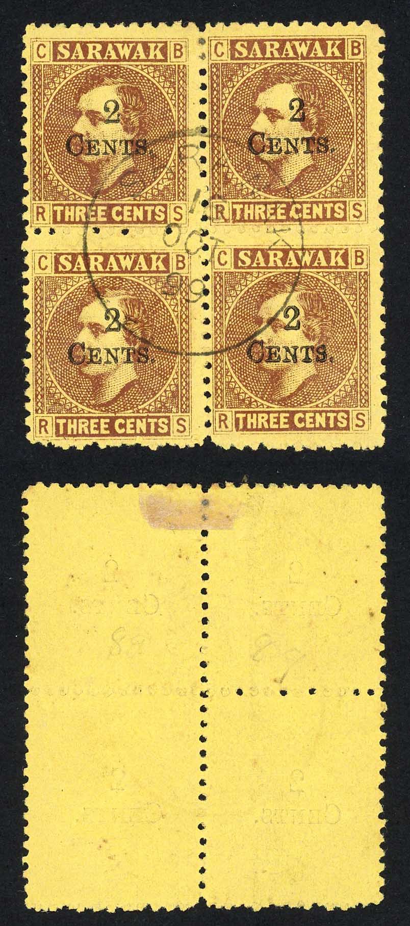 Sarawak SG32 2c on 3c Top Right Stamp Long Tailed R (9/10) Fine used