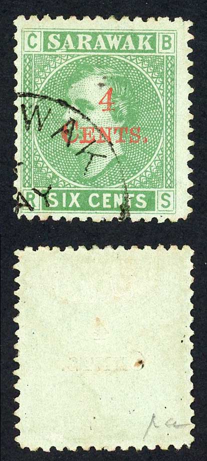 Sarawak SG34 4c on 6c Green CDS used Cat 120 pounds